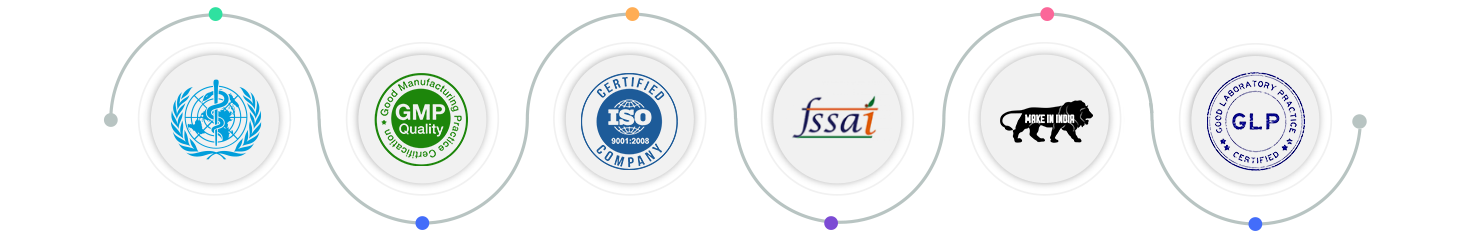 Display certifications including WHO, GMP, ISO, FSSAI, & Make in India &, and GLP to establish credibility and trust.